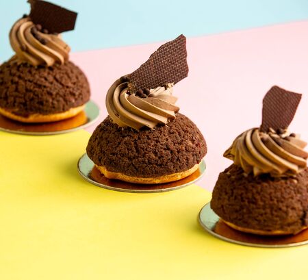 Confectionery products. Chocolate cakes with white cream sprinkled with chocolate chips.