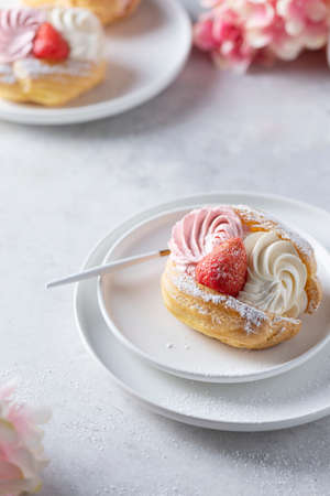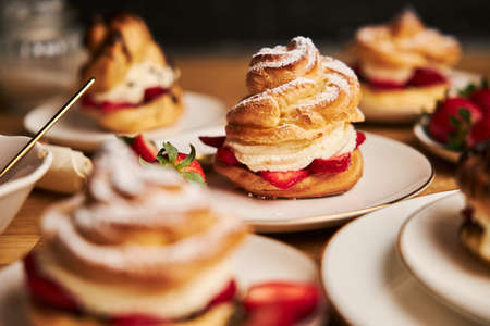 Homemade choux cream or cream puffs with custard cream and strawberry. Homemade bakery concept.