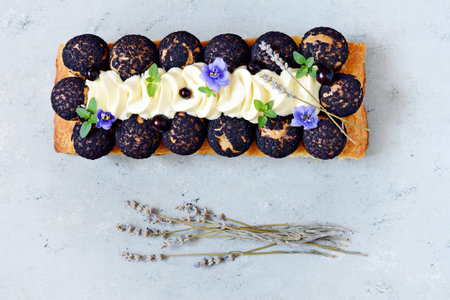 Dessert Saint Onore. Berry pie. Puff pastry tart with profiteroles, butter cream, black currant jam with fresh mint, lavender flowers and berries. Gourmet french dessert on gray background.