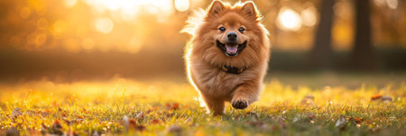 A fluffy, brown, thick-coated dog with a playful disposition strolls through a sun-drenched park surrounded by colorful autumn leaves, demonstrating a joyful time spent outdoors.