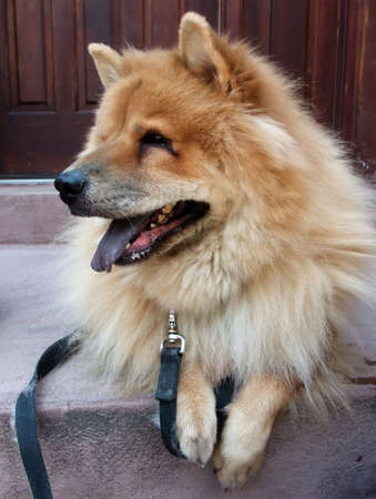 Chow Chow Breed Dog on Leash Seated on Front Stoop