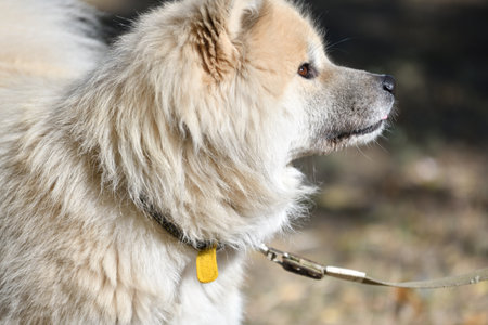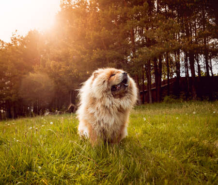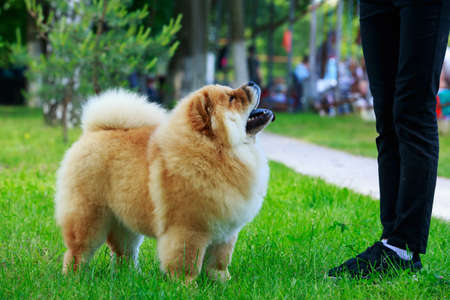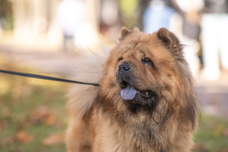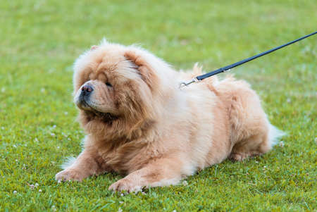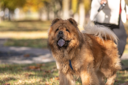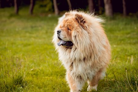 A beautiful purebred chow-chow dog on a walk in a summer park.