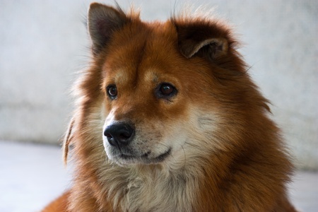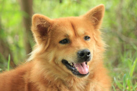 A closeup of the fluffy brown adorable domestic dog against the blurry background