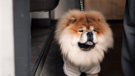 A fluffy Chow Chow dog wearing a light-colored sweater. The dog is on a leash and appears friendly.