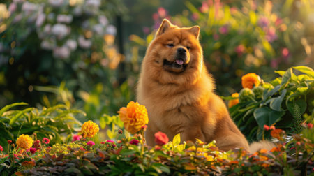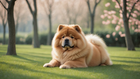 AI Generated. A Fluffy Golden Chow Chow Dog Poses Serenely on a Lush Green Lawn Surrounded by Trees and Distant Pink Blooms