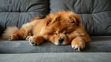 a cute light brown fluffy Chow puppy lounging on the sofa, captured in a heartwarming full-body shot