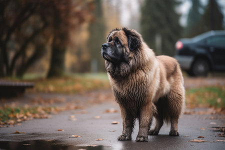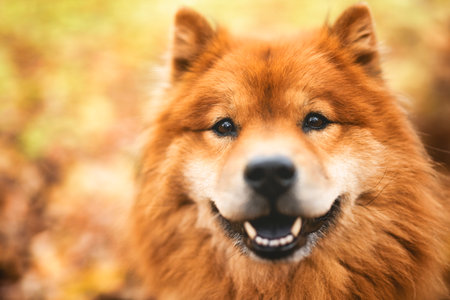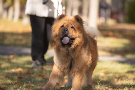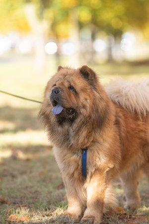A fluffy, brown, thick-coated dog with a playful disposition, the Chow Chow strolls through a sun-drenched park surrounded by colorful autumn leaves, demonstrating a joyful time spent outdoors.