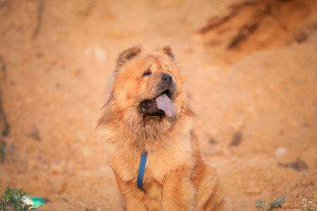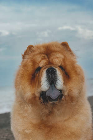 Chow chow purebred dog brown color male head portrait on the sand near the sea