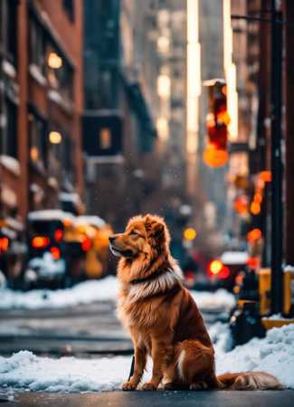 Cute Nova Scotia Duck Tolling Retriever dog sitting on a snowy street. ai generative.