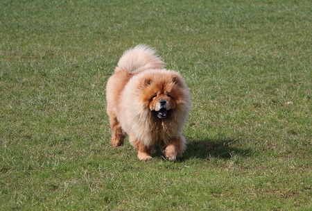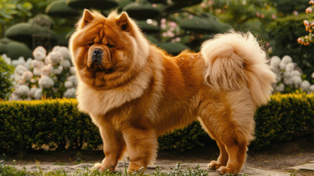 A fluffy Chow Chow with its distinctive lion-like mane, standing proudly in a garden.