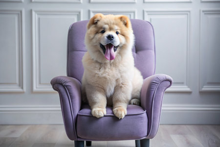 Portrait of a cute joyful puppy of the Chow Chow breed. A banner with the image of a pet dog in the interior of a white and purple living room. The dog is sitting on a purple armchair.