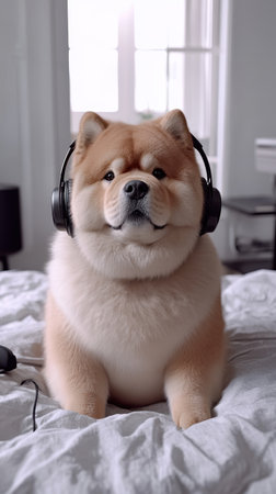 A fluffy dog sits upright on a bed, wearing oversized headphones. The room is bright and airy, with natural light streaming through windows, creating a calm atmosphere.