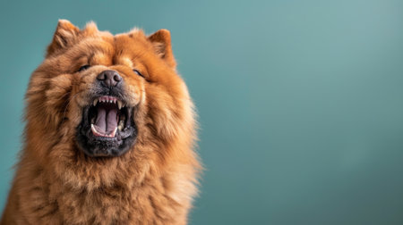 Chow Chow, angry dog baring its teeth, studio lighting pastel background