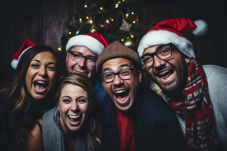 A Joyful Gathering of Friends Celebrating the Holiday Season, Wearing Festive Christmas Masks and Making Silly Faces for a Memorable Photo