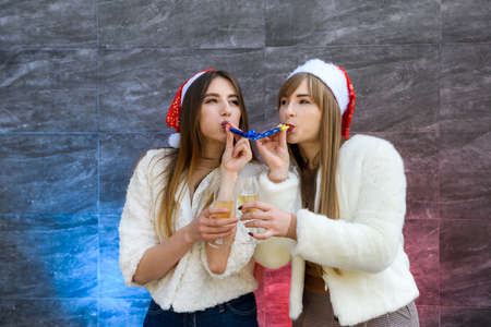 Two girls in santa hats with champagne glasses celebrate new year