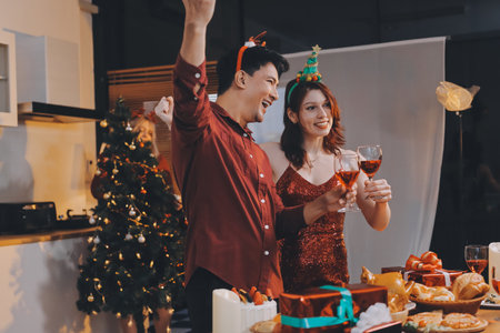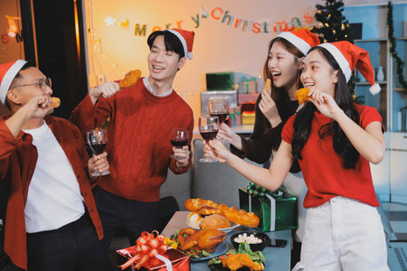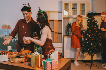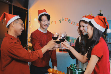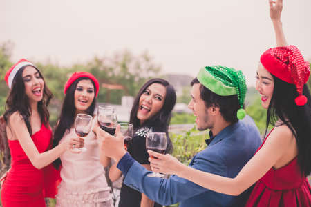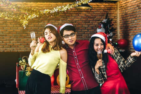 Enjoying Christmas and New Year party. Group of beautiful asian young people in Christmas party looking happy and drink wine and champagne.