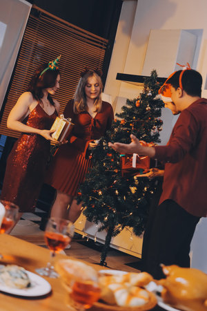Group of happy Asian friends celebrating Christmas and decorate the Christmas tree indoors. Beauty woman with Christmas Gifts. New Year party. Woman hands decorate Christmas tree red ball, bauble.