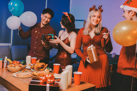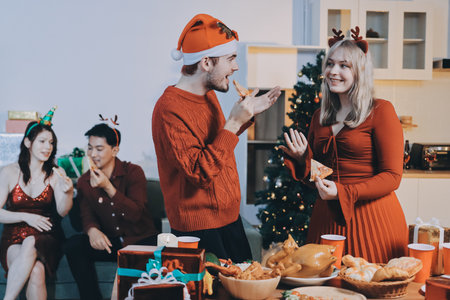 Friends both man and woman or young people are gathering for Christmas and New Year holiday, singing, smiling at each other, and celebrating the happiness festival