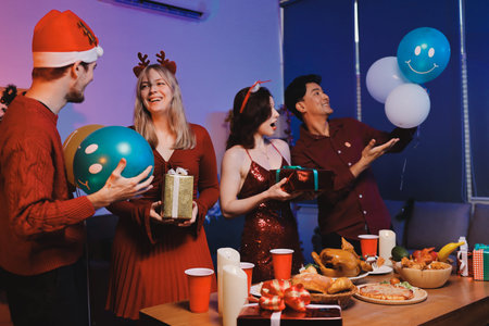 Group of young Asian man and women as friends having fun at a New Year's celebration, holding gift boxes standing by Christmas tree decoration, midnight countdown Party at home with holiday season.