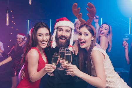 Joyful friends in Santa hat, color bra and funny eyeglasses enjoy Christmas or New Year night celebrate x-mas noel give toast screaming looking at camera cheering wine glasses. Winter holiday party