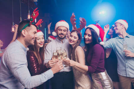 Portrait of nice attractive stylish cheerful cheery positive funny ladies and guys having fun rest relax tradition winter vacation December at modern luxury fogged lights nightclub