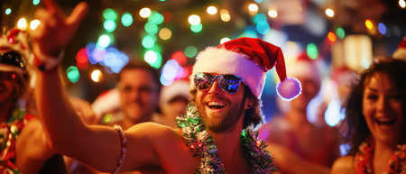 Portrait of a group of friends in santa hats dancing in a nightclub