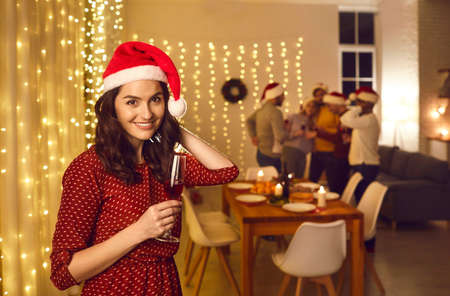 Happy good looking young single woman in polka dot dress and Santa cap holding wine glass and smiling at camera standing against background of decorated interior on Christmas party night with friends