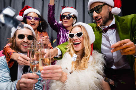 young adult interracial friends in santa hats and sunglasses having party on gray background