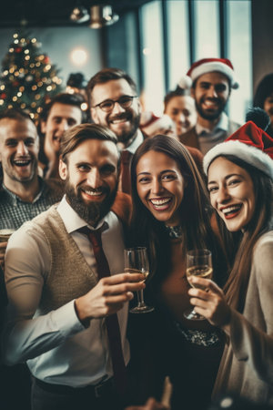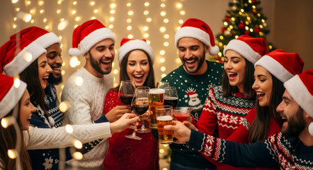 gathering of friends celebrating Christmas, their faces aglow with joy and warmth, set against the backdrop of a festively adorned Christmas tree.High resolution AI generated