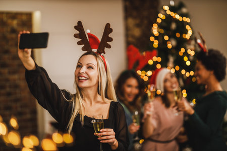 Cheerful woman having fun and taking a selfie with her female friends on Christmas or New Year's home party.