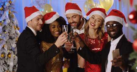 A few mixed races friends in glamorous style of clothes and santa clauses hats smiling and posing with glasses of Champaigne in the smart phone while making selfies at the luxury party. Indoors. Portrait shot