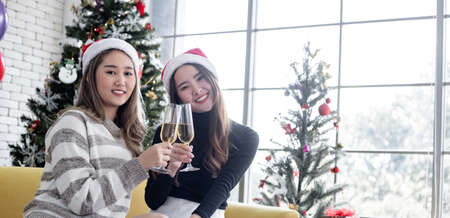 Two young Asian women with clink glasses and drank wine at home in celebrate Christmas together. Celebration of new year at home. Two lovely Thai girls celebrating Christmas and new year.