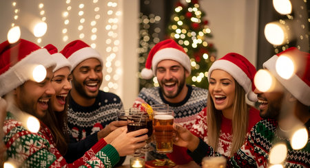 Group of friends in Christmas sweaters drinking beer and having fun at home