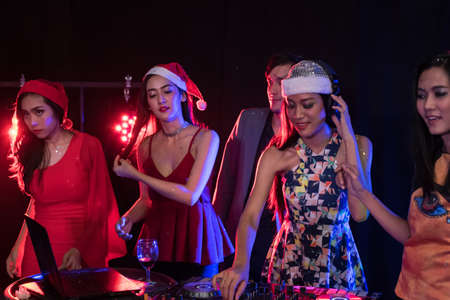 Young Asian group man and women dancing new year christmas party in midnight december at nightclub countdown luxury