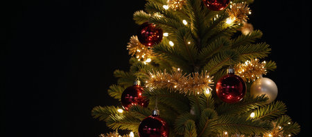 A beautifully adorned Christmas tree glowing with warm lights against a dark starry background during the festive season