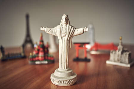 Travel concept background. Souvenirs iconic monuments. Bolivia or Brazil.