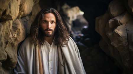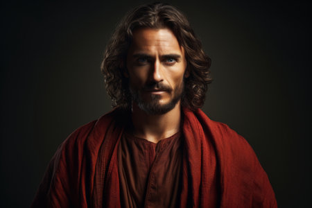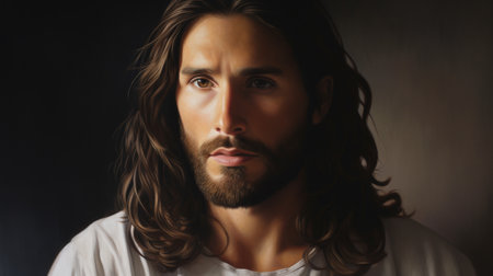 Portrait of a Man Dressed as Jesus. White robe. Long brown hair and beard. Man appears to be in his early 30s, and he has a serious expression on his face. Christian religion and faith. AI generated.