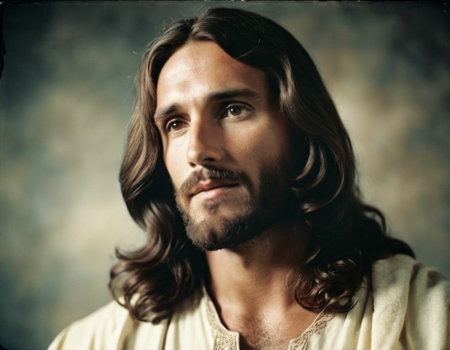 Close-Up Portrait of a Man Dressed as Jesus. White robe. Long brown hair and beard. Man appears to be in his early 30s, and he has a serious expression on his face. Christian religion and faith. AI.
