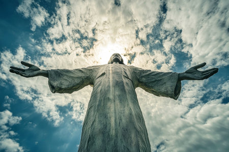 A striking and detailed representation of Jesus Christ with open arms standing amid vibrant clouds and beams of light. The wide-angle view captures a sense of majestic serenity and grace.