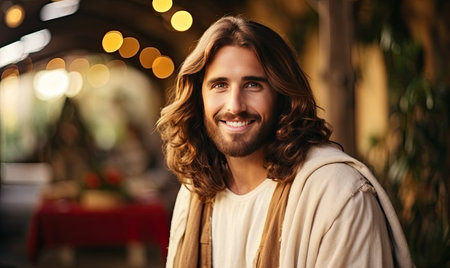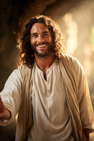 Jesus Christ smiling Savior of Humanity The Lamb of God who takes away the sin of the World Generative AI Illustration.