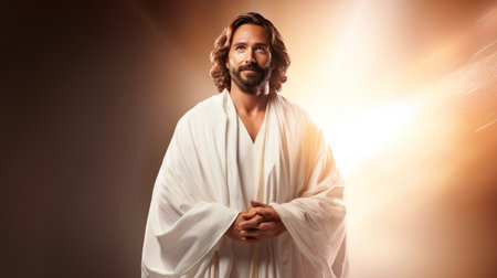 Portrait of Jesus Christ in his traditional white robe against sunset sky background.