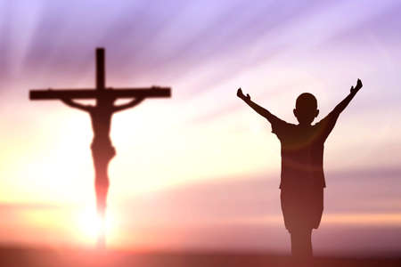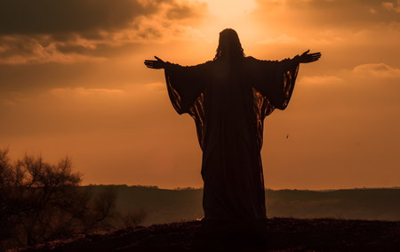 Rear view silhouette of Jesus Christ raised hands and praying to god with a sunset sky background