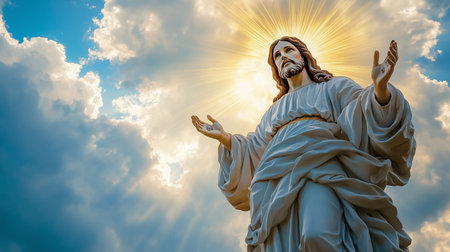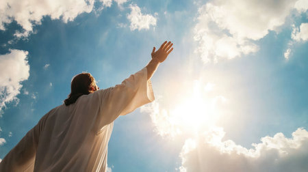 Jesus Christ in white clothes extends his hand to you against the sky as a symbol of Christianity