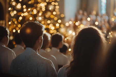 A close-up of choir members in a church, illuminated by soft golden lights, singing Christmas hymns in a serene setting.
