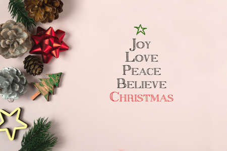 Christmas wishes in the form of a tree: joy,love,peace,believe.Christmas background with inspirational text on a conceptual image. Greeting card for happy holidays.