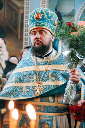 VOYUTYN, Volyn / UKRAINE - October 14 2009: Orthodox priest during holiday prayers in local church