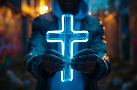 Man with glowing neon cross