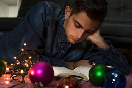 young at home reading with christmas decorations and lights