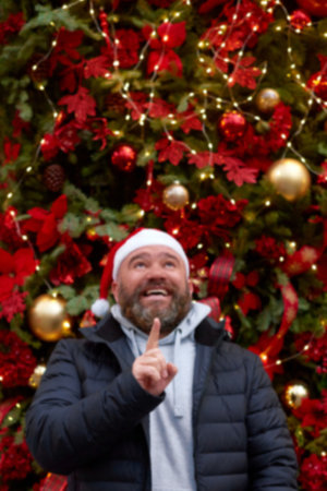 blurry and defocus man in santa claus hat point up finger on christmas tree background