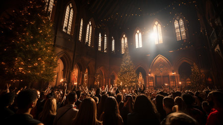Congregation celebrating christmas mass holding candles in church